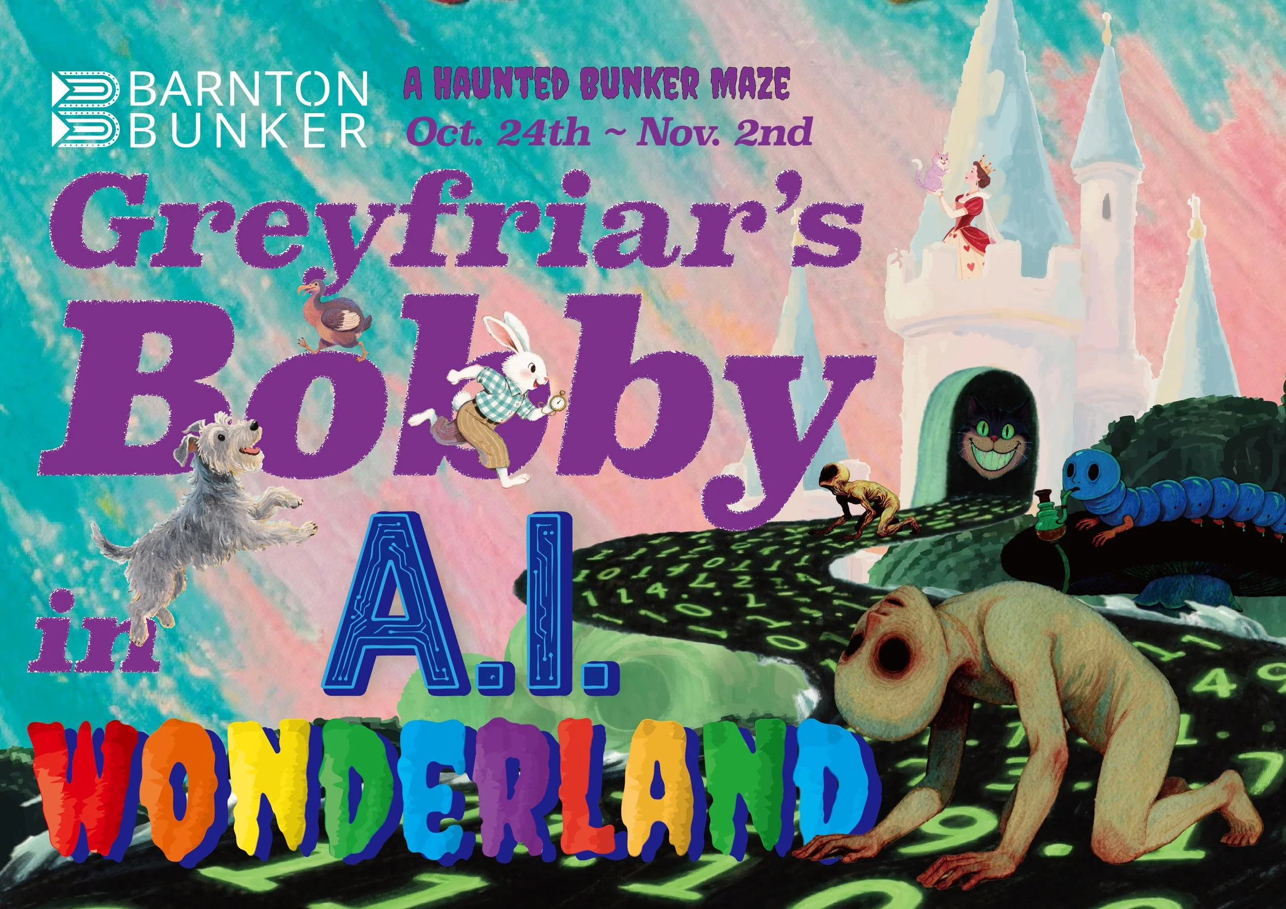 Descend into an AI-warped Wonderland at Barnton Bunker. Two versions: Not-So-Scary (ages 3+) and Scary (ages 12+). 20-minute tours, groups of 15. First hour is Not-So-Scary. A surreal Halloween story beneath Edinburgh.